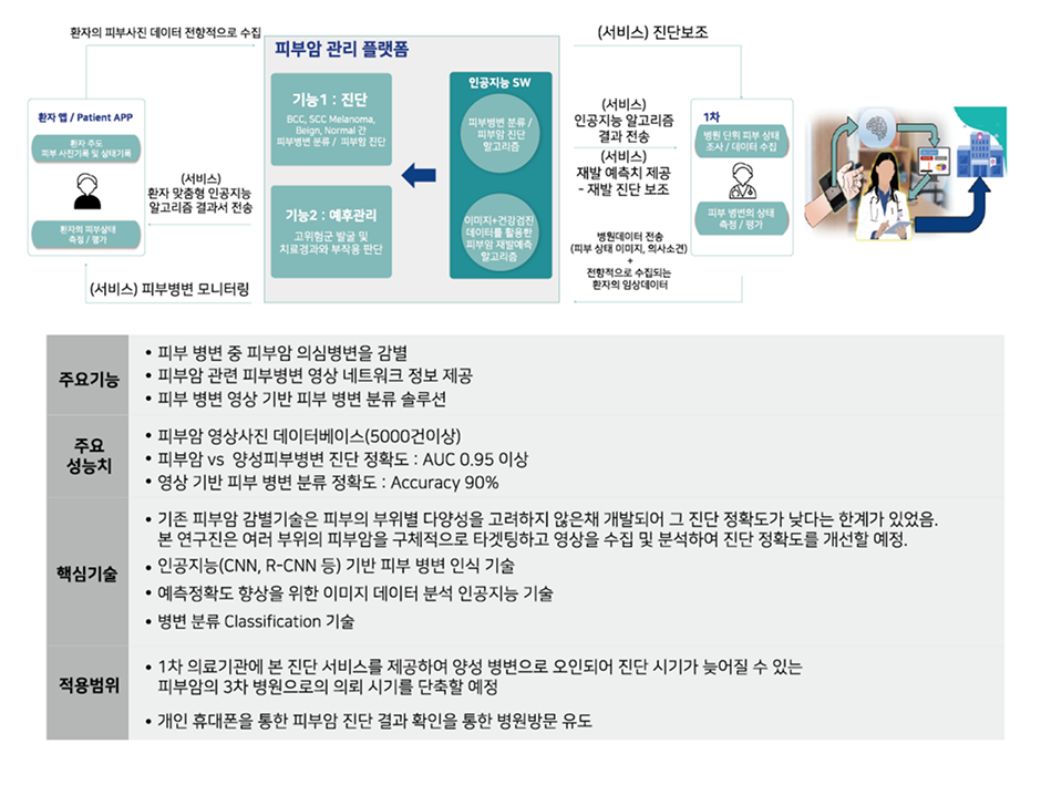 1차 의료기관에 내원한 피부질환 환자 피부사진을 스마트폰 카메라 등으로 손쉽게 획득하여 종양성, 색소성 피부병변의 악성 및 양성종양 감별 진단에 대한 접근성을 향상시키고, 남성형탈모 환자의 모발사진을 밀착형 카메라로 획득하여 밀도 예측을 통한 치료 계획 수립 AI S/W 개발.