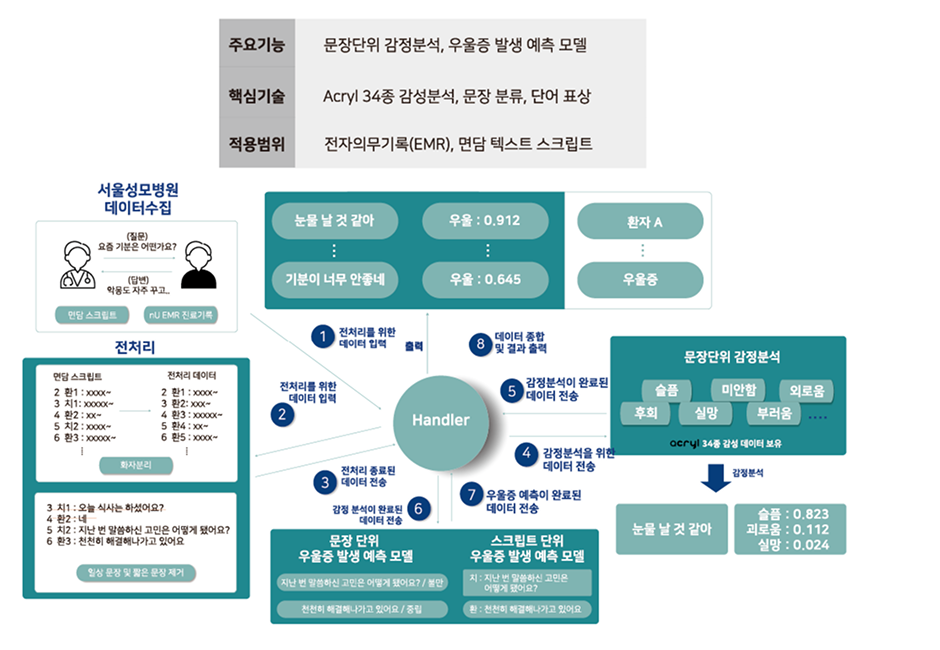의사와의 대화, 진료기록 및 약물 사용 이력등의 정보를 이용하여 우울증 발생을 예측하고, 약물 치료반응을 모니터링 하는 인공지능 소프트웨어의 개발.